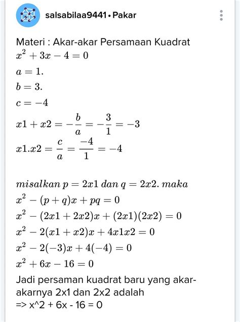 Berikut adalah beberapa tips dan trik yang dapat membantu kamu dalam menyelesaikan X1 dan X2: 1. Pastikan persamaan kuadratik sudah dalam bentuk standar yaitu ax² + bx + c = 0. 2. Periksa diskriminan (b² - 4ac) terlebih dahulu. Jika diskriminan negatif, maka persamaan tidak memiliki akar real. 3. Jika diskriminan positif, gunakan rumus kuadrat untuk menyelesaikan X1 dan X2. 4. Jika diskriminan nol, maka persamaan hanya memiliki satu akar. 5. Jangan lupa untuk memeriksa jawaban yang sudah ditemukan dengan memasukkannya ke dalam persamaan kuadratik.